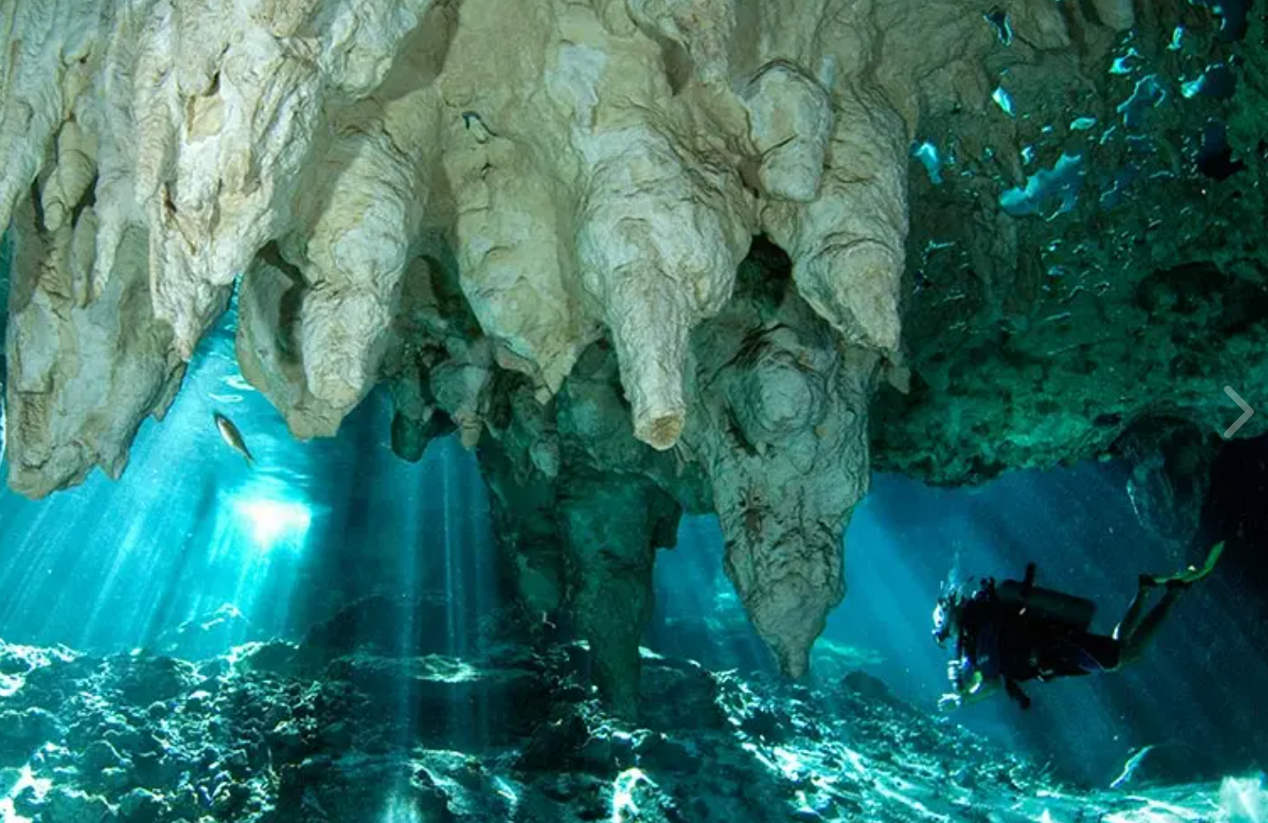 En medio de la jungla de Yucatán se encuentran unos pequeños lagos donde se han descubierto unas comunicaciones con unas cavernas subacuáticas únicas en todo el planeta, los mundialmente famosos Cenotes. Ver las impresionantes estalactitas de piedra caliza de estas cavernas es un privilegio exclusivo de los afortunados que bucean en los Cenotes. Una visibilidad superior a los 60 metros, aquí, no es algo fuera de lo común, dando la impresión de que se flota en medio del aire.
